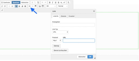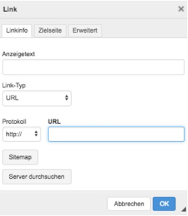 Sollten Sie Ihrem Text einen Link zufügen wollen, klicken Sie auf den Link-Button (Schleife) und es öffnet sich ein neues Fenster: