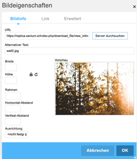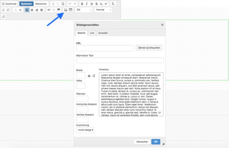 Sollten Sie Ihrem Inhaltsblock ein Bild hinzufügen wollen, klicken Sie in der Menüleiste auf den „Bild“-Button und es öffnet sich nachfolgendes Fenster: