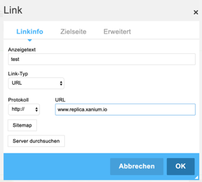 Unter „Linkinfo“ kann der Anzeigetext, der Link-Typ und der URL bestimmt werden.