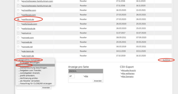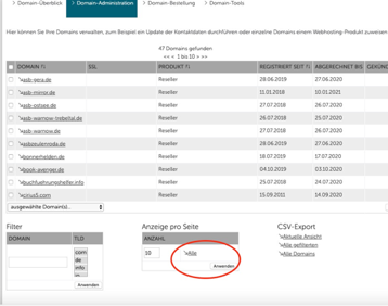 Wenn die neue Domain nicht mit in der Ansicht steht, unten bei Anzeige pro Seite auf „Alle“ klicken
