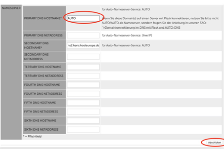 Jetzt bei „Primary DNS Hostname“ – „AUTO” reinschreiben und unten auf „Abschicken“ gehen