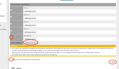 Nun beim Namensserver auf die E-Mail-Adresse info@xanweb.com umstellen, Häkchen beim Hinweis setzen und auf „weiter“ gehen