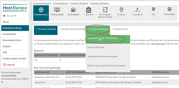 Nun auf „Domain-Bestellung“ klicken und dort „Domain bestellen/transferieren“ anklicken.