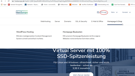 Auf „hosteurope.de“ gehen und zum Einloggen auf „KIS Login“ klicken.