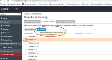 Sollte sie unter den gesperrten aufgelistet sein, kann man sie wieder freigeben. Dazu setzt man vor die entsprechende IP Adresse ein Häkchen in die Box und geht auf den Butten „Remove“ (Remove the selected IP addresses from the list to trusted addresses) – siehe folgendes Bild:
