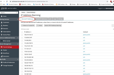 Hier kann man auf dem Reiter „Banned IP Addresses“ alle gesperrten IP-Adressen aufgelistet sehen (siehe folgendes Bild):