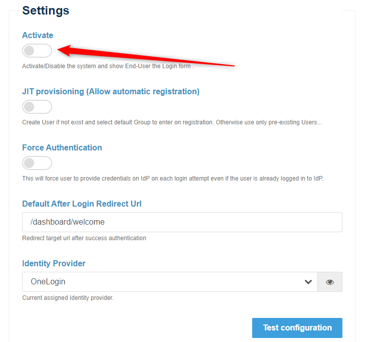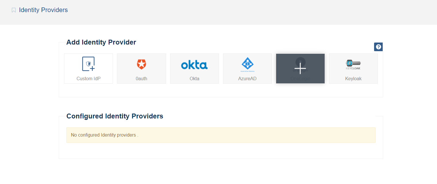 In Settings section, select your configured Identity provider ( OneLogin ) (from step above) appeared in the configured IdPs list .